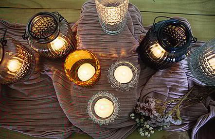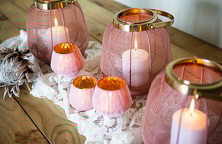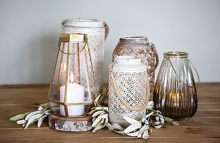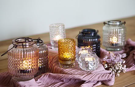 From cut glass to brass, amber to blush pink, gold or glam, we’ve got your table top sorted. There’s also some lovely lantern styles to add light from above. From $3.00.